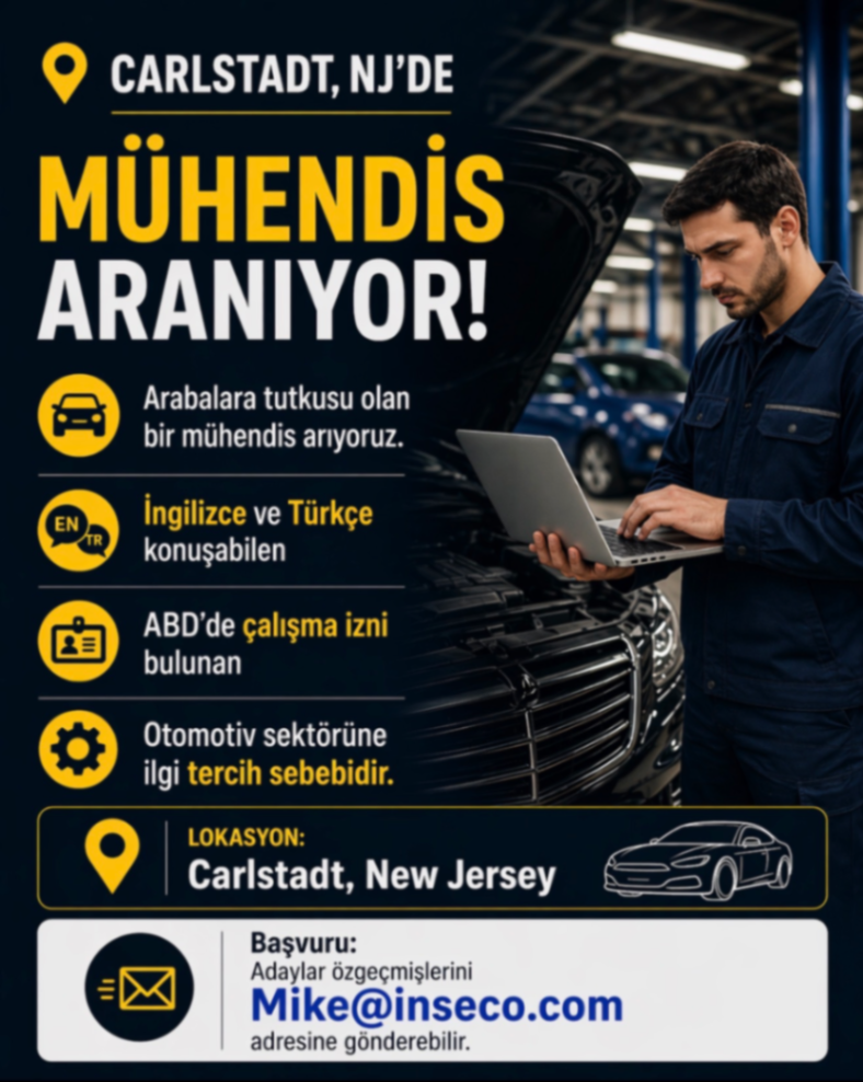 Arabalara tutkusu olan, İngilizce ve Türkçe konuşabilen, ABD’de çalışma izni bulunan bir mühendis arıyoruz. 📍 Lokasyon: Carlstadt, New Jersey 🔧 Otomotiv sektörüne ilgi tercih sebebidir 📩 Başvuru: Adaylar özgeçmişlerini Mike@inseco.com adresine gönderebilir.